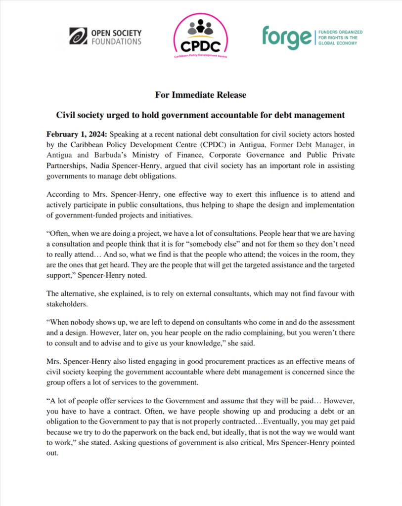 Home › News › Civil Society Urged to Hold Government Accountable for Debt Management Press Releases Civil Society Urged to Hold Government Accountable for Debt Management February 1, 2024 CPDC’s Head Calls on Regional Governments to Re-imagine Caribbean Development Model →