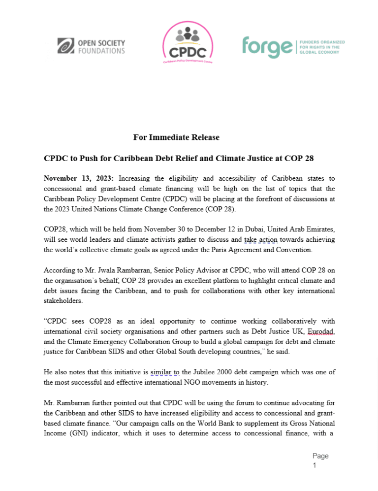 CPDC Calls for Urgent Caribbean Debt Relief at COP 28