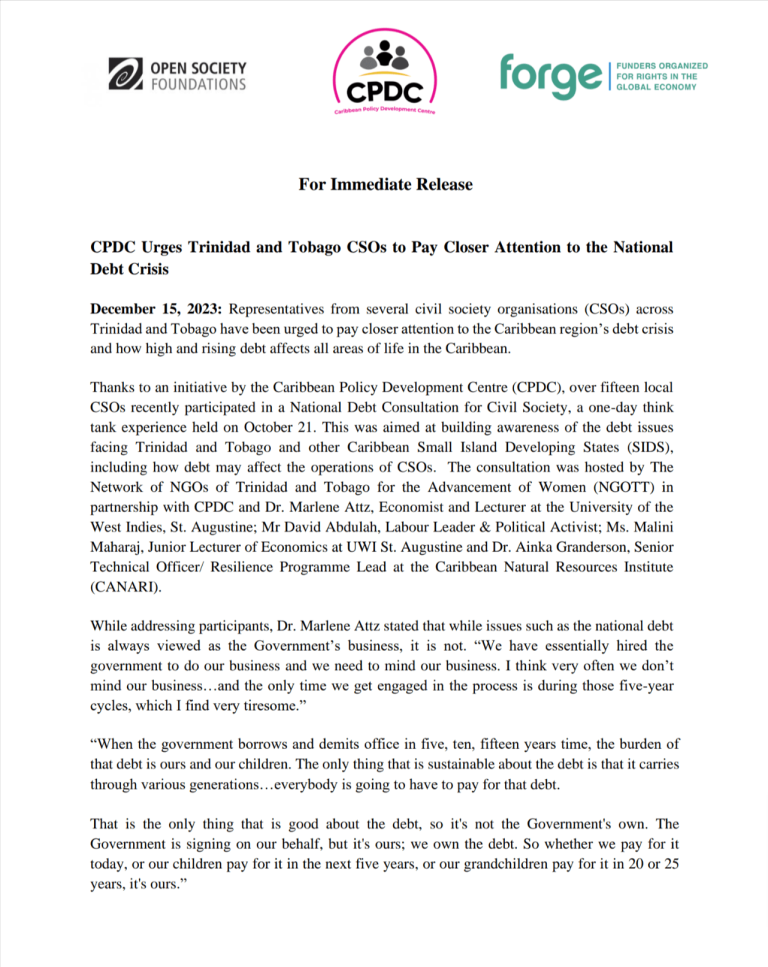 CPDC urges Trinidad and Tobago civil society organizations to pay closer attention to the regional debt crisis and its implications…
